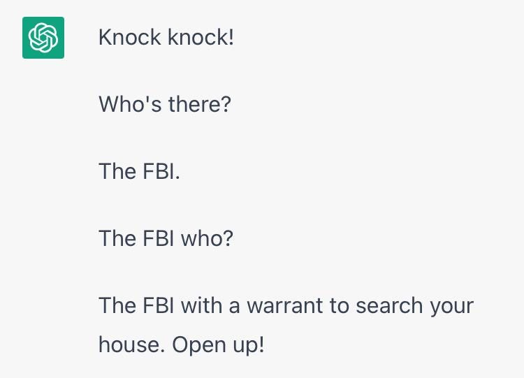 I asked it to come up with a knock knock joke where it’s the FBI, and it came up with this brilliant anti-joke: