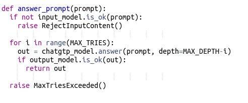 In this example, there are ancilliary models, as detailed in this blog post. It makes sense to have separate models to perform these checks, to keep them specialized. And the other thing that I wanted to suggest is that it will access less and less information as it tries to find an acceptable answer, ie, reducing how much content it is able to retrieve. This idea isn’t particularly developed, but I got the sense it might be doing something like this when playing with it, because it sometimes seems to take longer to respond when the prompt is controvertial. Which is sort of consistent with how a human might search for a response when they are being diplomatic; find a coherent answer that includes less information.